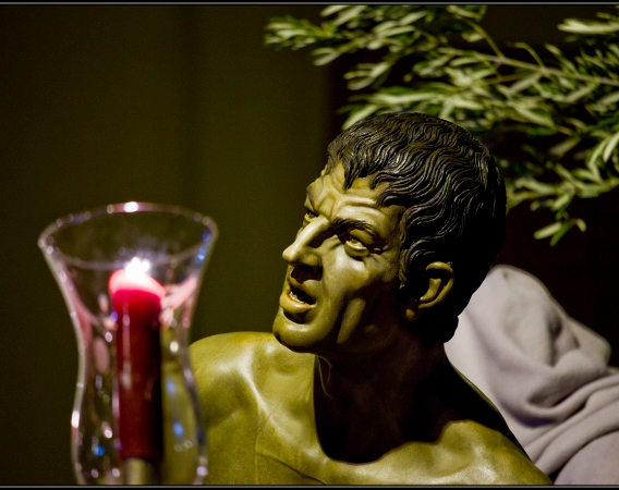 · MALCO, sirviente del Sumo Sacerdote Caifás, intentando esquivar la espada que le acaba de herir su oreja derecha, realizado en 2022 por el escultor sevillano D. Jesús Cepeda.